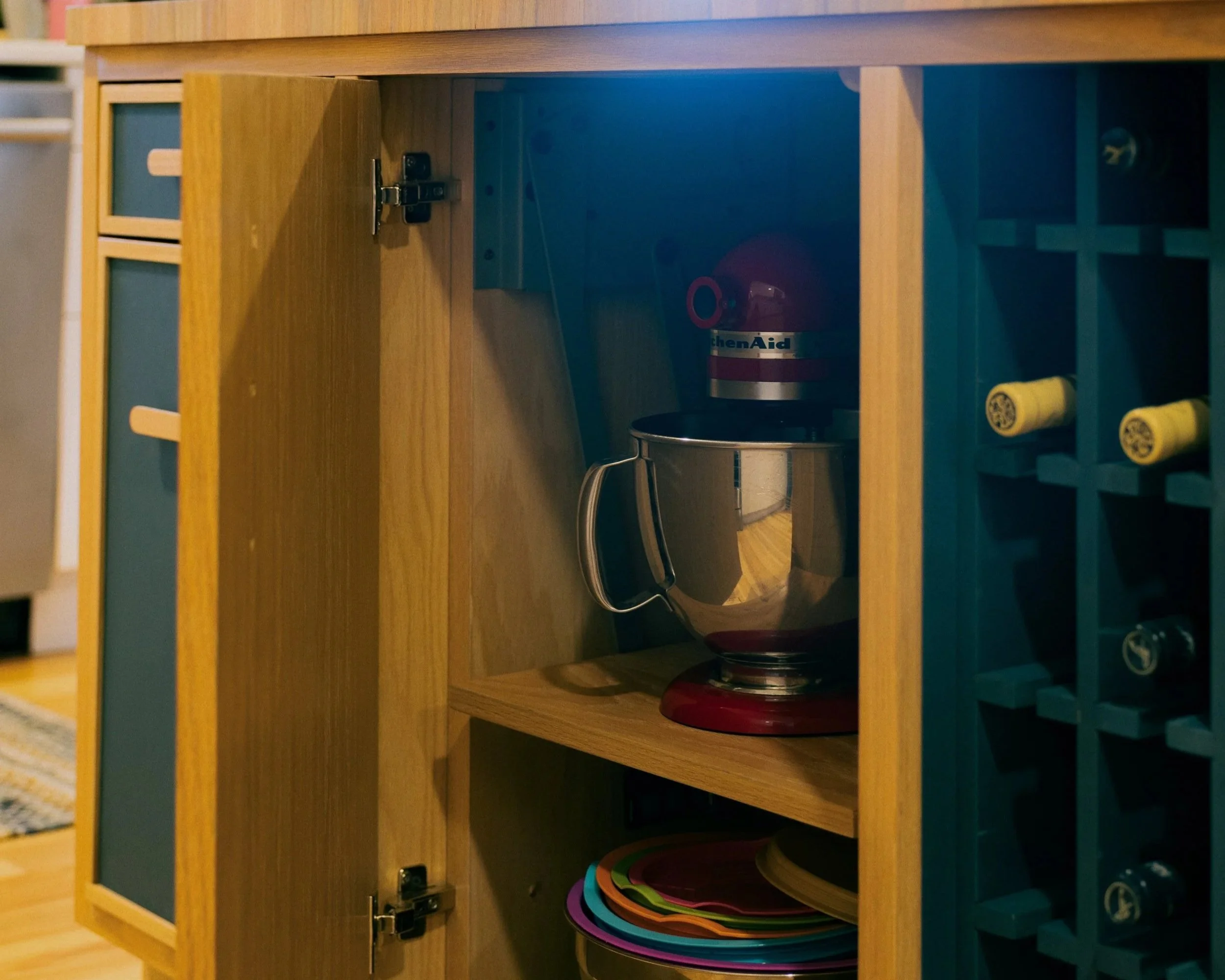 Elena & Josh’s island features a wine rack, a baker’s cabinet, open shelves for display, and a conversation-style flush extension countertop – every detail 100% designed around their rituals and the activities they love.